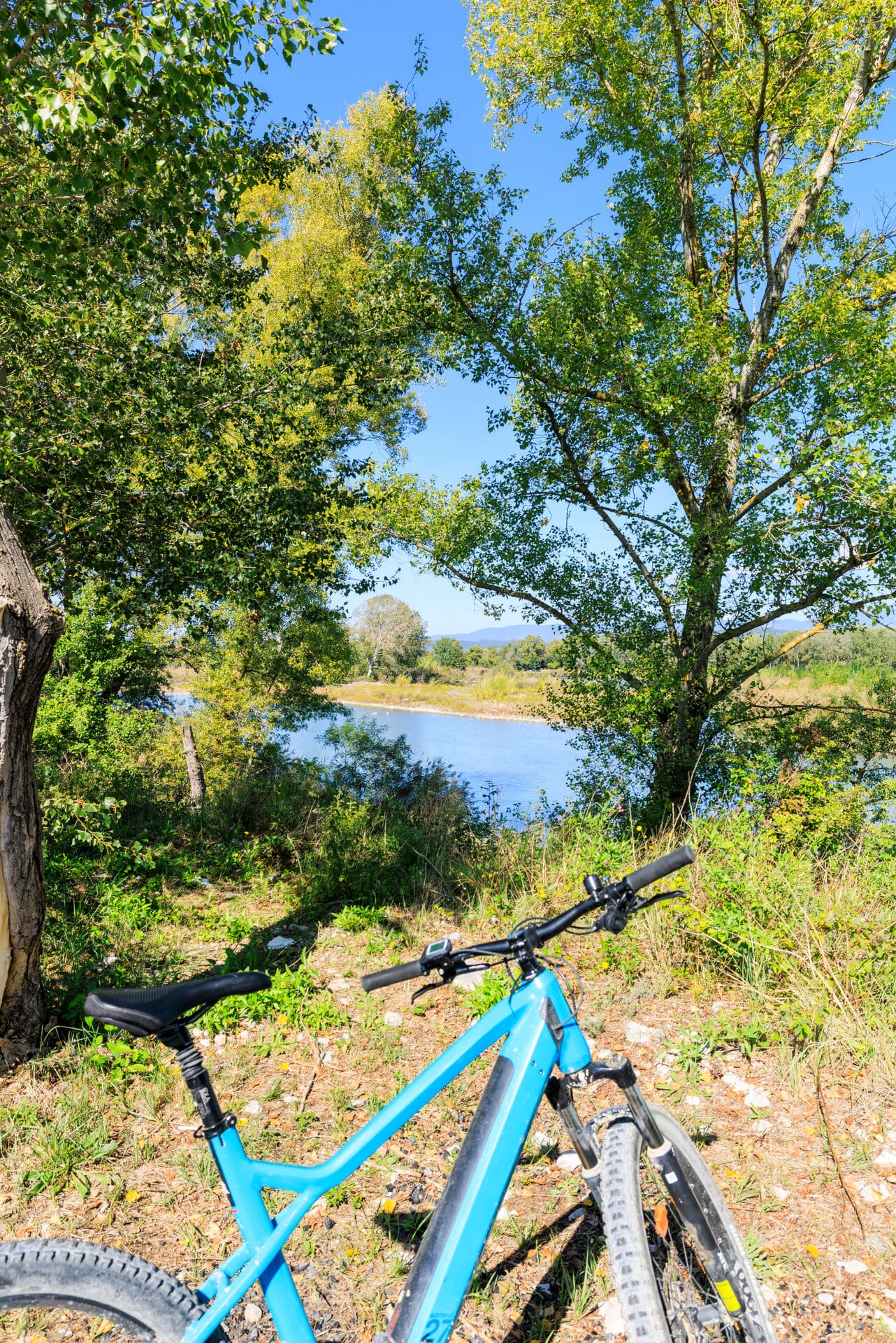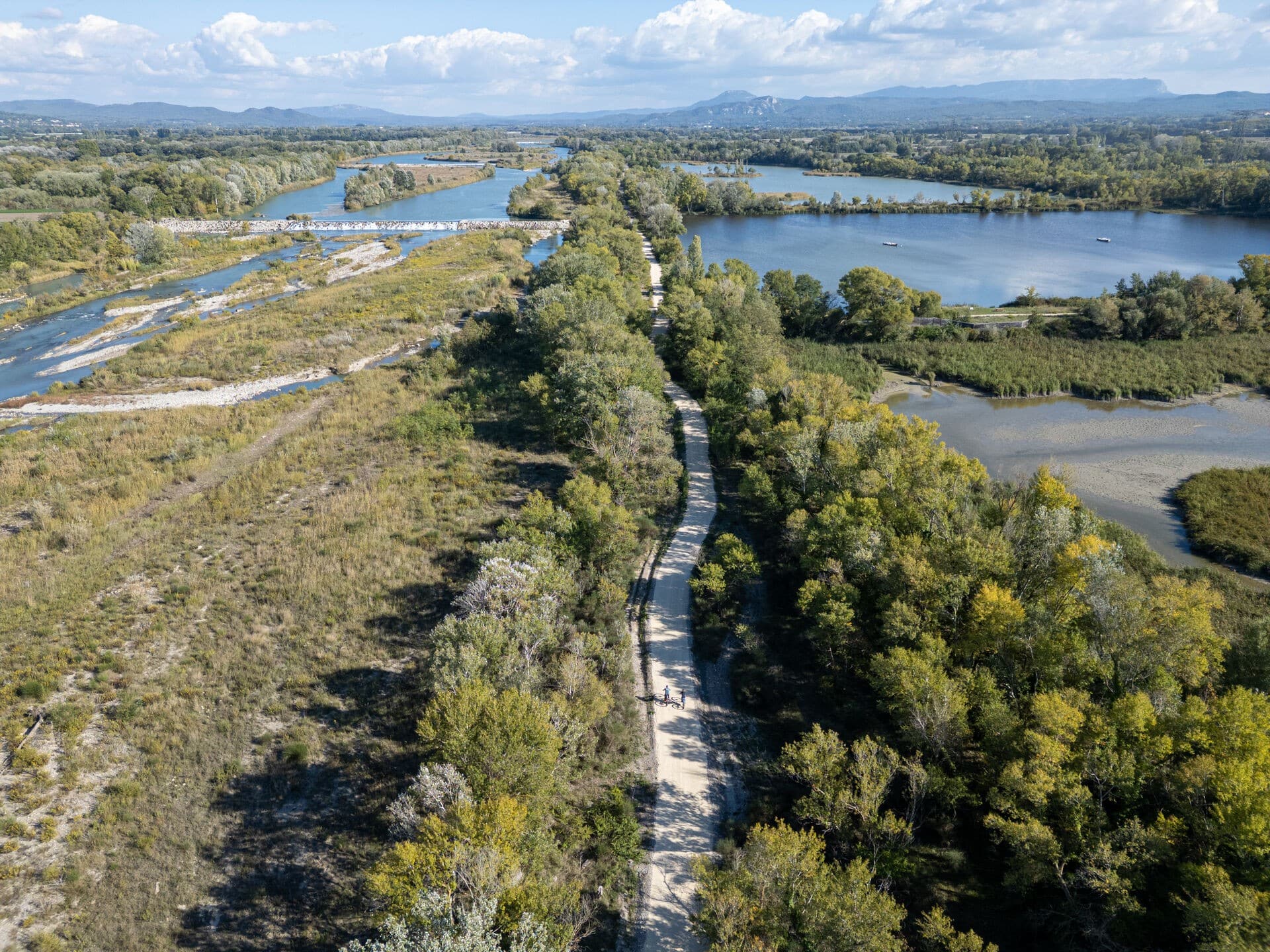 Depuis l’aire de loisirs du Farigoulier, la Durance à vélo emprunte les pistes en crêtes de digue vers les épis de Jouve ou de Tarteau.